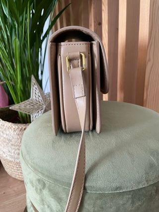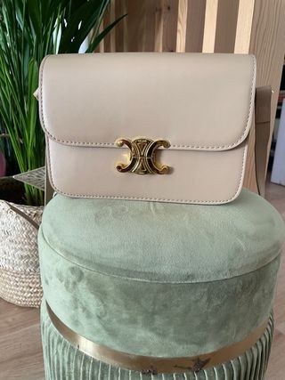 Mala elegante, com um design sofisticado. - Cor bege com detalhes dourados - pele sintetica
