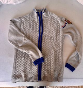 Cardigan de malha com fecho frontal e detalhes em azul. - Padrão trançado. - Gola alta. - Punhos e barra com acabamento em azul.