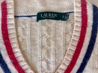 Pulôver de malha com tranças e gola V, estilo cricket. - Detalhes listrados em vermelho e azul marinho na gola e punhos. - Barra com listras em vermelho e azul marinho.