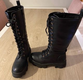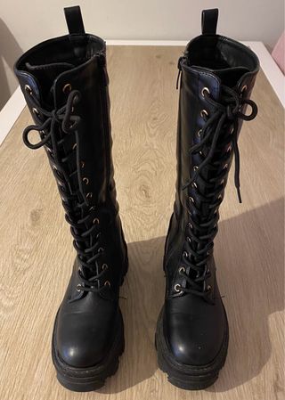 Botas militares pretas de cano alto. - Fecho lateral com atacadores. - Detalhes em metal dourado nos ilhós. - Sola grossa e robusta.
