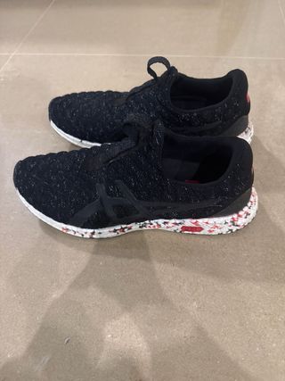 Tênis Asics Hyper Gel Kenzen. - Tamanho 45. - Design moderno com detalhes em preto e multicolorido. - Solado em borracha preta.