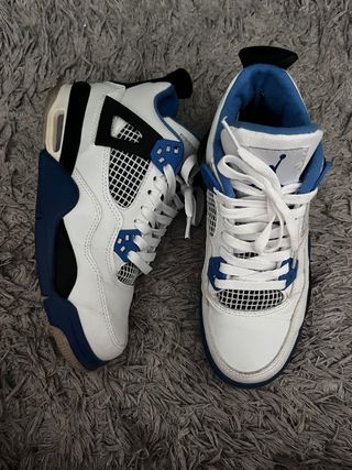 Tênis Jordan 4 com detalhes em azul e branco. - Design icônico. - Cadarços brancos. - Solado em borracha.