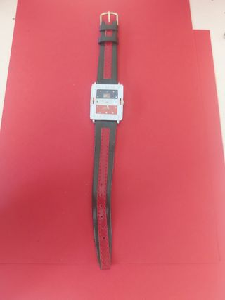 Relógio Tommy Hilfiger quadrado, com bracelete em pele preta e vermelha. Apresenta-se em bom estado. - Mostrador com detalhes da marca. - Caixa em aço. - Fecho de fivela.