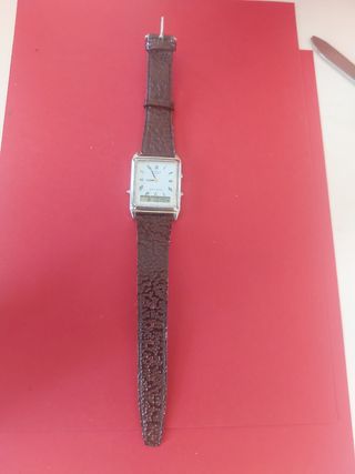 Relógio de pulso Casio, com mostrador analógico e digital. Apresenta-se em bom estado, com caixa em aço prateado e bracelete em pele castanha. - Mostrador duplo (analógico e digital) - Bracelete em pele - Caixa em aço inoxidável