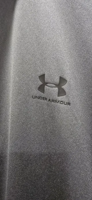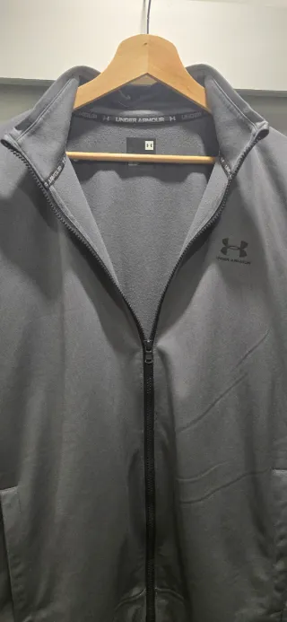 Casaco de malha cinzento da Under Armour, com fecho completo. - Gola alta. - Bolsos laterais. - Logótipo da marca no peito.