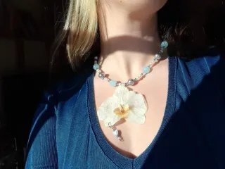 Colar artesanal com uma orquídea Phalaenopsis branca preservada em resina. - Contas brancas, prateadas e azuis. - Pingente em forma de flor no fecho. - Adorno na orquídea em forma de coração. - Flor de orquídea real. - Colar único e alternativo. - Feito à mão com cuidado e carinho. As imperfeições fazem parte da beleza de usar flores reais que são preservadas por mãos reais! Evita contacto constante e prolongado com a luz solar para aumentares a longevidade da cor das orquídeas!