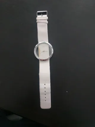 Relógio Calvin Klein com bracelete branca e caixa prateada. Necessita de reparação. - Design moderno com caixa redonda. - Bracelete em pele com vários furos para ajuste.