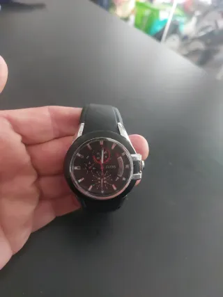 Relógio da marca Guess com design moderno e elegante. - Caixa em metal prateado. - Bracelete em borracha preta. - Mostrador com detalhes em vermelho. O relógio deixou de funcionar, não sei o que tem.