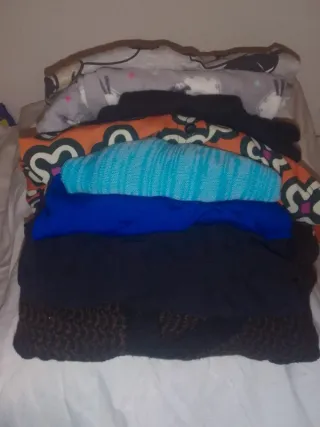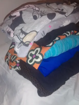 Conjunto de 8 peças de roupa quente usada em bom estado em tamanho M. Inclui calças pijama tamanho L - Peça com estampa de personagem,blusa de pijama. - Peça com estampa floral. - Peça em azul royal. - Peça em azul claro com textura. - Peça em preto. - Peça em marrom com textura. - Peça em cinza com detalhes,calças de pijama. - Peça em preto.