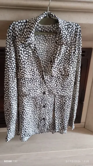 Camisa com um padrão distinto em preto e branco. - Padrão de manchas. - Fecho de botões à frente. - Gola clássica.