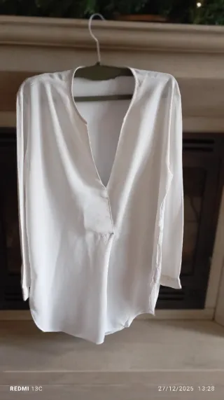 Camisa elegante da Zara, em branco. - Tecido leve e fluido. - Decote em V. - Mangas compridas com punho.