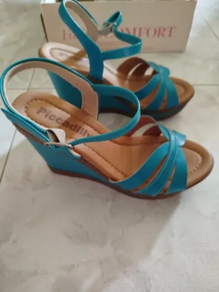 Sandálias de senhora Piccadilly com cunha. - Cor azul e bege. - Tamanho 37.