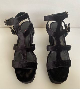 Sandálias de plataforma pretas da marca Uterqüe. Estão em excelente estado. - Modelo de salto alto (8cm). - Design elegante e sofisticado. - Feitas de veludo. - Inclui dustbag