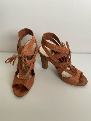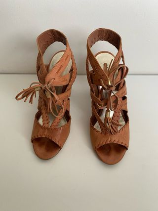 Sandálias Guess em pele castanha. Um calçado elegante e confortável, ideal para diversas ocasiões. - Modelo de salto alto (9.5cm). - Design de tiras entrelaçadas. - Detalhes em franjas. - Fecho com atacadores. - Dustbag incluido