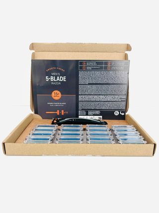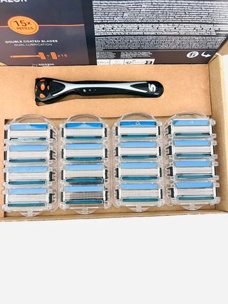 Conjunto de barbear by Amazon, novo na caixa (uma lâmina usada). - Sistema de 5 lâminas - Inclui 15 recargas - Barbear confortável e preciso - Ideal para uso diário
