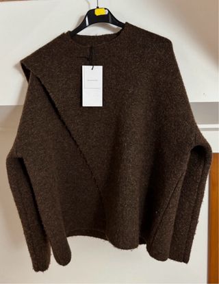 Peça de malha com um design único que inclui um cachecol integrado. O tecido tem uma textura agradável e um caimento elegante. - Design assimétrico com detalhe de cachecol. - Malha macia e quente. - Acabamento de qualidade.