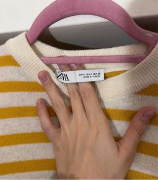 Malha de riscas brancas e cinza claro com decote a barco. - Malha confortável. - Padrão de riscas horizontais. - Mede de cava a cava 54 cm e tem de altura 57 cm.