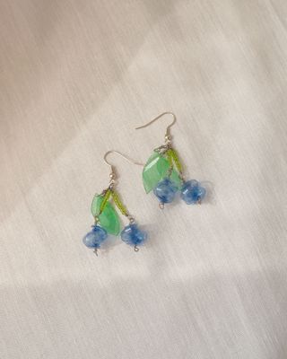 Conjunto de brincos artesanais com um design delicado e colorido. - Elementos em forma de bagas azuis. - Detalhes em forma de folhas verdes. - Contas verdes pequenas. - Fecho tipo anzol.