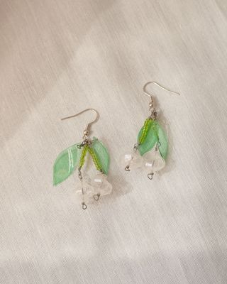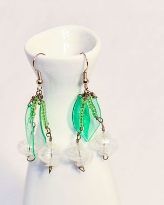 Estes brincos combinam elementos transparentes com contas verdes, criando um visual delicado. - Design com contas em cascata. - Elementos em plástico transparente. - Detalhes em metal.