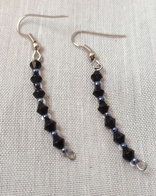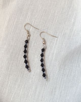 Par de brincos delicados com um design elegante. - Contas pretas facetadas. - Detalhes em contas prateadas. - Fecho tipo anzol prateado.