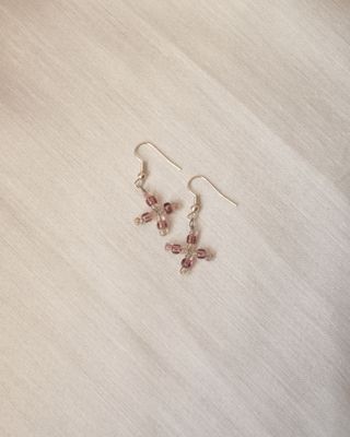 Estes brincos em forma de cruz são feitos com pequenas contas. - Design delicado em forma de cruz. - Contas em tons de rosa e prateado.
