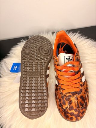Tênis Adidas Samba com estampa de onça e detalhes em laranja. - Design exclusivo com estampa animal. - Cadarços na cor laranja vibrante. - Três listras icônicas da Adidas nas laterais. - Solado em borracha marrom.