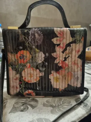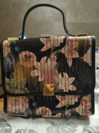 Mala de mão com um design floral vibrante sobre fundo preto. - Padrão floral com flores em tons de rosa e detalhes em verde. - Acabamento brilhante com linhas verticais. - Detalhes dourados no fecho e nas laterais.