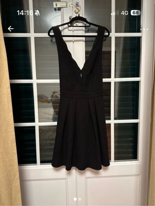 Vestido curto com decote em V profundo e cintura marcada. - Tecido com bom caimento. - Saia com pregas.