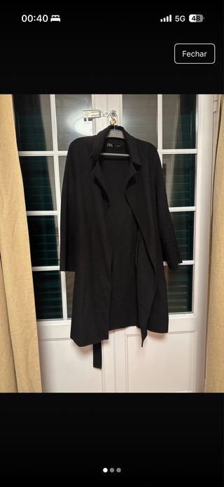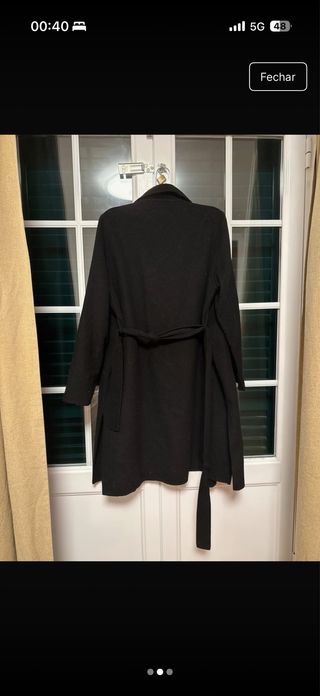 Sobretudo preto com fecho estilo robe. - Design elegante e moderno. - Cinto para ajuste na cintura.