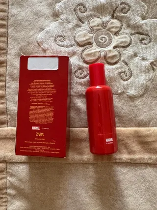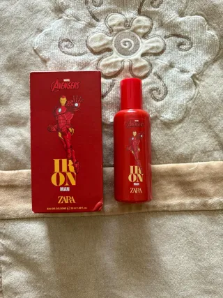 Eau de Cologne infantil da ZARA com tema do Homem de Ferro. - Embalagem vermelha com ilustração do Homem de Ferro. - Frasco de 50 ml.