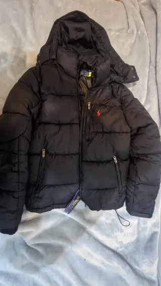 Casaco acolchoado da Ralph Lauren em preto. - Logo da marca bordado no peito. - Fecho de correr frontal. - Bolsos laterais com fecho. - Capuz.