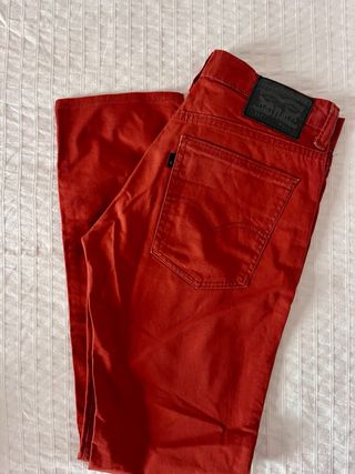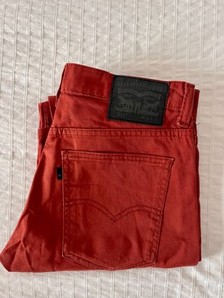 Calças de ganga Levis 511 para homem em tom vermelho. - Modelo 511. - Etiqueta traseira preta. - Costura dupla nos bolsos traseiros.