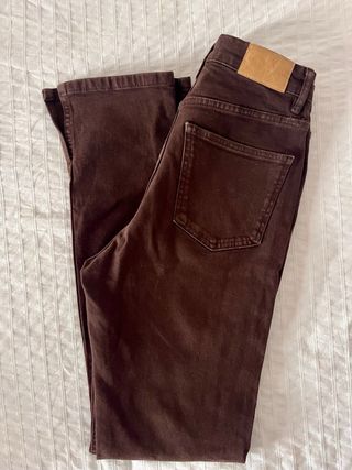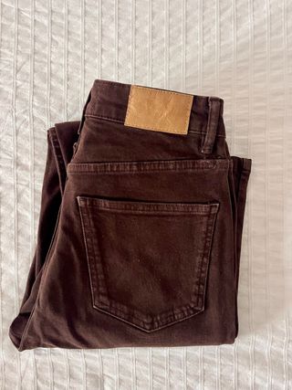 Calças de ganga em tom castanho. - Etiqueta de couro na parte de trás. - Bolsos clássicos.