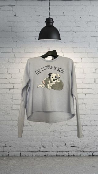 Camisola de manga comprida com uma divertida estampa. - Estampa de um cão dálmata a dormir com um gato. - Frase THE CUDDLE IS REAL na frente. - Cor azul claro. -Usada apenas duas vezes.