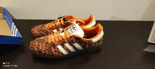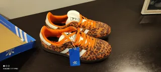 Sapatilhas Adidas com um design de leopardo vibrante e atacadores laranja. - Padrão de leopardo. - Detalhes em branco. - Interior laranja.
