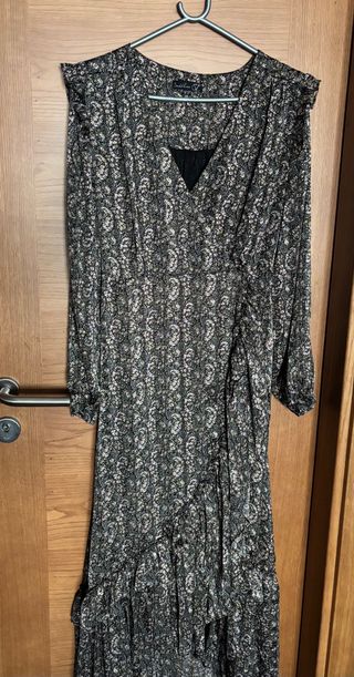 Vestido comprido com um padrão floral e paisley. - Decote em V. - Mangas compridas. - Detalhe de folhos na barra.