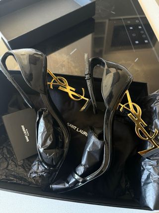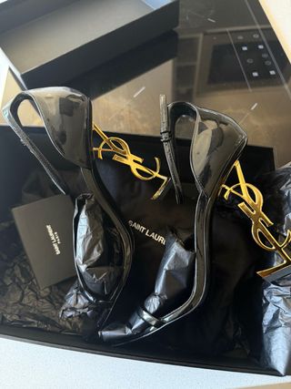Sandálias de salto alto Yves Saint Laurent originais Opyum em preto. - usada poucas vezes e com sinais de uso - tem caixa, saco de armazenamento e certificado de autenticidade - Design icónico com logo YSL dourado. - Acabamento em verniz brilhante. - Tiras finas e fecho ajustável