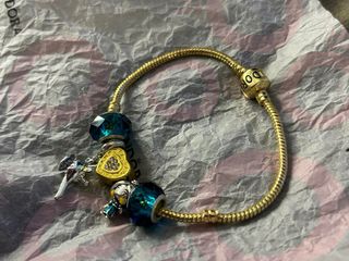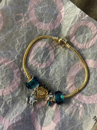Pulseira Pandora em tom dourado com vários pingentes decorativos. - Pingente de coração com pedras brilhantes. - Pingente de figura feminina. - Contas de vidro em tom azul-petróleo.