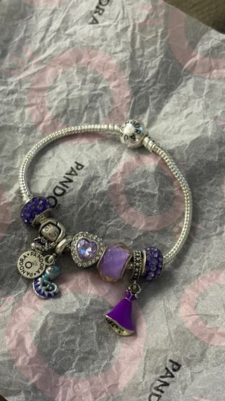 Pulseira Pandora com tema Disney, em tons de roxo e prateado Uma peça única e encantadora. - Charm de coração com pedras roxas. - Charm de sino roxo. - Charm de polvo azul. - Charm com a figura de uma pessoa. - Fecho com o logo da Pandora.