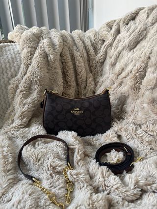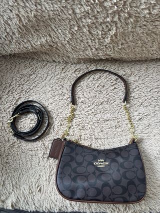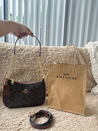 Mala da Coach, acompanhada com alça maior, modelo Teri, em castanho escuro. - Design clássico e elegante. - Ferragens douradas. - Alça de ombro ajustável.