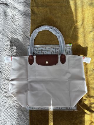 Mala de senhora. - Cor bege. - Fecho de correr. - Alças em couro sintético. - Interior com dois compartimentos.