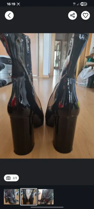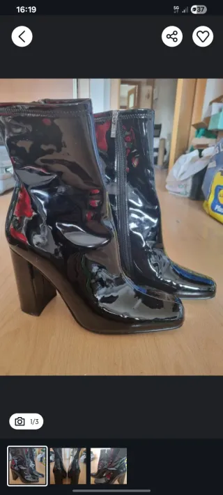 Botas de salto alto em verniz. - Design elegante e moderno. - Fecho lateral para facilitar o calçar. - Salto grosso robusto. - usadas uma vez, em excelente estado