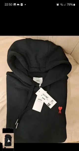 Hoodie da Ami Paris em azul, tamanho M. Possui o icónico coração Ami bordado no peito. - Gola com capuz e cordões. - Bolso frontal tipo canguru. - Punhos e bainha canelados.
