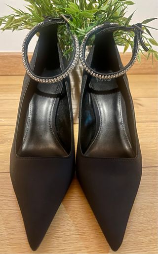 Elegantes sapatos de salto alto da Mango, perfeitos para festas e cerimónias. Usado 1 vez. - Design com biqueira afiada. - Tira de tornozelo adornada com pedrarias. - Cor preta com detalhes prateados.