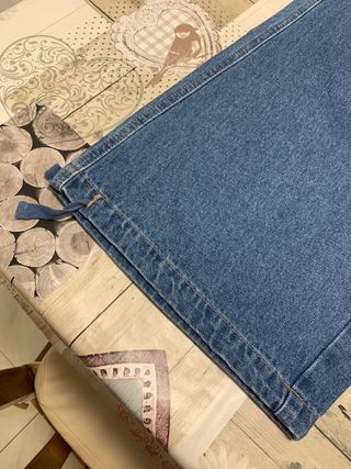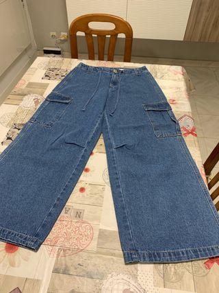 Calças de ganga com um corte largo e moderno. - Bolsos cargo nas laterais. - Cordão ajustável na cintura. - Tecido de ganga resistente. - marcam 34 mas vestem até 36