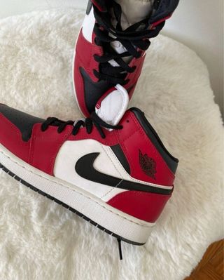 Sapatilhas Nike Air Jordan de cano médio. - Design icónico em preto e vermelho. - Detalhes em branco contrastantes. - Sola branca. - Cadarços pretos.