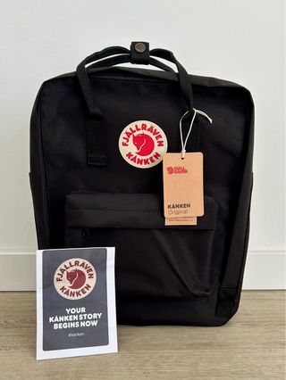 Mochila Fjällräven Kanken tamanho grande, com etiquetas. - Design clássico e funcional. - Capacidade 20 Litros - Compartimento principal espaçoso. - Alças ajustáveis para conforto. - Logo icônico da marca.