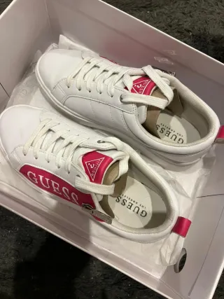 Tênis da marca Guess em branco com detalhes em rosa. - Logo da Guess na lateral. - Detalhe triangular rosa na língua. - Cadarços brancos. - Solado branco. - usado poucas vezes