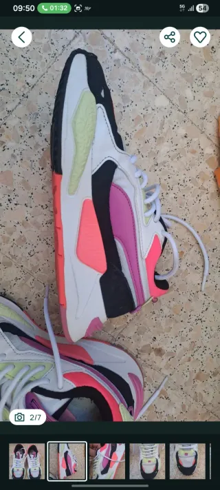 Tênis Puma RS-X com um design moderno e vibrante. - Combinação de cores: branco, rosa e verde limão. - Detalhes em preto e coral. - Cadarços brancos. - Etiqueta com logo RS-X na língua.