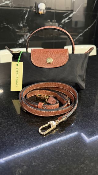 Bolsa Longchamp tamanho XS em preto com detalhes em castanho. - Alça de mão e alça de ombro removível. - Fecho com botão de pressão e aba. - Ferragens douradas.